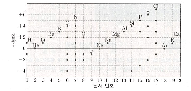 위 그림을 보면 원자가 가질 수 있는 가장 높은 산화수는 그 원소의 원자가 전자 수와 같다는 것을 알 수 있다.